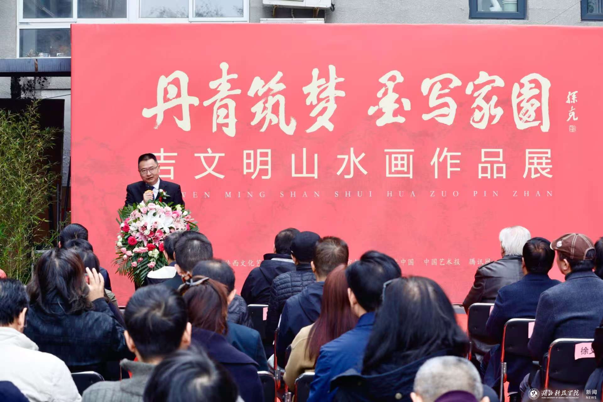 李岱在致辞中表示,吉文明老师作为我校艺术与设计学院的杰出教师代表,以其独特的艺术语言,在传统与现代的对话中构建起独具个性的表达体系。他的作品既有对山水精神的深刻领悟,又饱含对当代生活的敏锐洞察,在笔墨流转间展现出令人印象深刻的美学品格。此次展览不仅是吉老师个人艺术创作成果的一次重要汇报,更是我校美育建设与艺术学科发展进程中的一个重要里程碑。他要求艺术与设计学院要以此次展览为新的起点,继续秉持“闳约深美”的艺术精神,坚持立德树人根本任务,将艺术创作与人才培养、社会服务、文化传承创新更紧密地结合起来,不断推出更多反映时代气象、陶冶高尚情操的优秀作品,培养出更多具有创新精神、实践能力与社会责任感的高素质艺术人才,为繁荣社会主义文化事业、建设社会主义文化强国作出新的更大贡献!