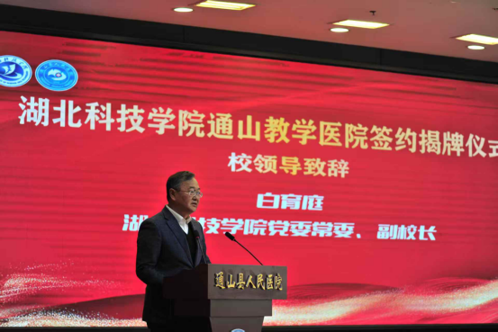 白育庭在致辞中对通山县委、县政府及县人民医院的支持表示感谢。他表示,湖北科技学院作为一所具有深厚医学教育底蕴的地方高校,始终以服务区域经济社会发展为己任。此次合作是学校深化产教融合、拓展临床教学资源的重要战略布局,希望双方在人才培养、学科建设、科研创新、社会服务等方面开展深度合作,实现资源共享、优势互补、互利共赢,共同打造校院合作的典范。