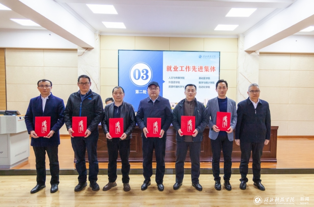 会议表彰了2025年就业工作先进集体和先进个人,招生就业处处长李建兵作就业工作专题汇报,自动化学院、外国语学院、数学与统计学院、第三临床学院(附属赤壁学院)等4个学院作了典型经验分享交流。