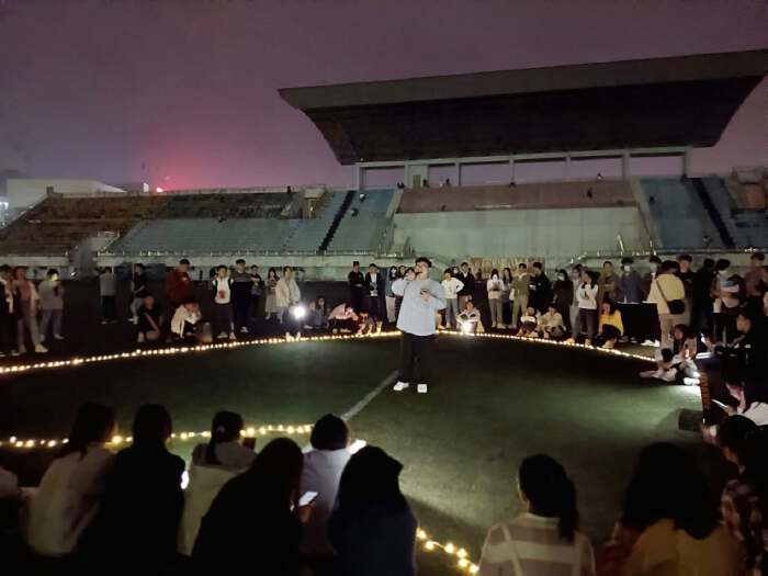 当晚七点,校园的钟声悄然敲响,学校宿舍楼灯光陆续熄灭。湖科学子们 陆陆续续从宿舍来到操场中央。充满活力的舞蹈、炫酷的说唱、悠扬的歌声……师生们打开手机闪光灯,伴着音乐的节拍挥舞着手中的光点。