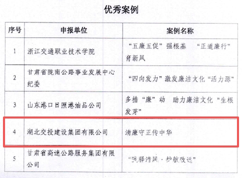 廉政歌曲《清廉守政传中华》由湖北交投建设集团有限公司申报,作词者为湖北省第六届精神文明建设“五个一工程”奖、西藏自治区第二届精神文明建设“五个一工程”奖获得者孙良言,作曲、演唱者为湖北科技学院音乐学院殷瑰姣教授。