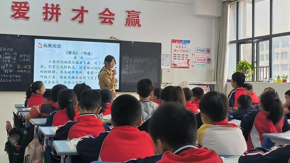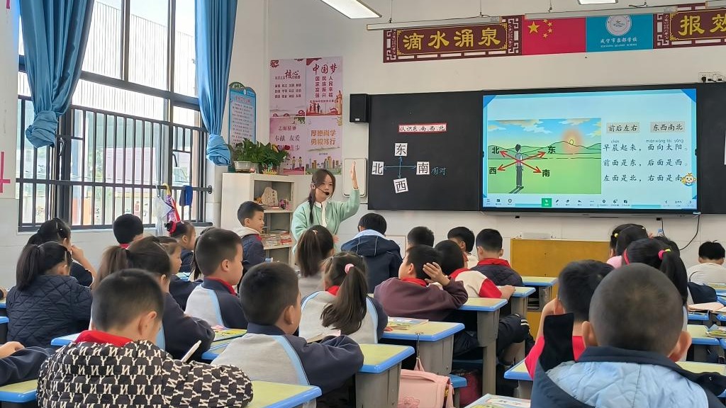 在附属泉都学校202班的数学课堂上,2022级师范生朱丹以《认识东南西北》为主题展开教学。课堂上,她结合低年级学生认知特点,用彩色方向卡片搭建“教室方向地图”,带领学生通过“找方向”“卡牌” 等游戏化环节,将抽象的方位知识转化为直观体验。课堂上,学生们拿着卡牌积极互动,气氛热烈。在市实验小学315班的语文课堂上,2022级师范生胡濛正在进行《搭船的鸟》第二课时的教学。她以“观察翠鸟”为主线,通过引导学生圈画文中动作描写词语,多种形式的朗读,帮助学生掌握细致观察的写作方法。互动环节中,胡濛鼓励学生分享自己观察过的小动物,将课文学习与生活实践紧密结合。