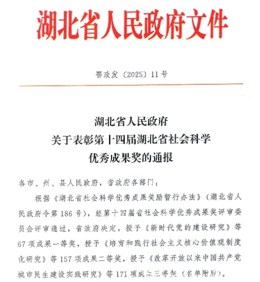 近日,湖北省人民政府发布《关于表彰第十四届湖北省社会科学优秀成果奖的通报》(鄂政发〔2025〕11号),我校三项成果均荣获三等奖,获奖总数实现单年历史性突破。