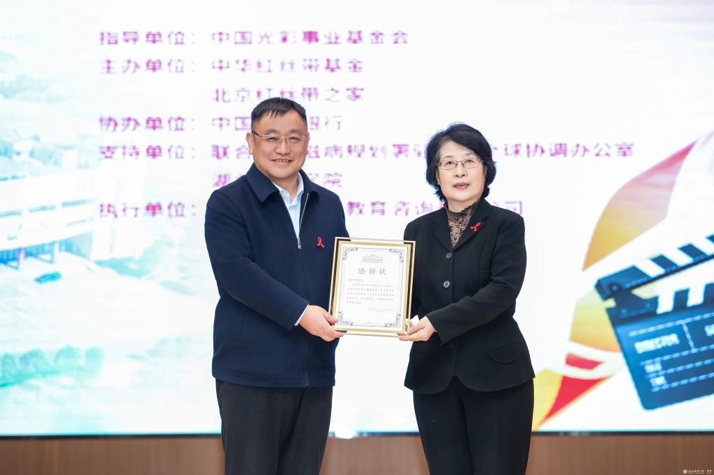 谷彦芬在致辞中肯定了湖北科技学院在防艾宣传与健康教育方面的积极探索,并代表中华红丝带基金向学校颁发感谢状,表彰其在青年健康教育与艾滋病防治工作中的突出贡献。