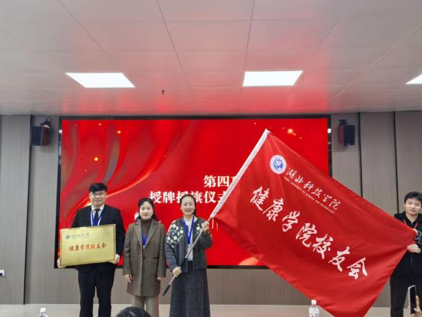 刘芳代表学校校友总会宣读健康学院校友会成立的批复文件,并向理事会授牌授旗、颁发聘书。