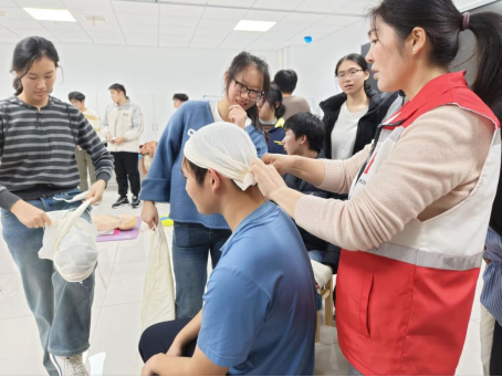随后的创伤包扎教学中,培训师现场示范了头部、手部包扎及骨折固定方法。同学们两人一组,轮流扮演“伤员”与“救护员”,认真完成清洁、敷料、包扎全流程演练,现场互动积极,学习氛围浓厚。