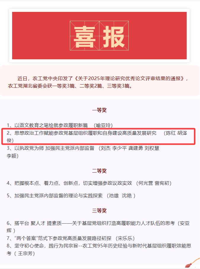 近日,中国农工民主党中央委员会印发《关于2025年理论研究优秀论文评审结果的通报》,对年度理论研究优秀成果进行表彰。在本次评选中,我校农工党党员、人文与传媒学院教师陈红撰写的论文《思想政治工作赋能参政党基层组织履职和自身建设高质量发展研究》,荣获农工党中央理论研究优秀论文一等奖。