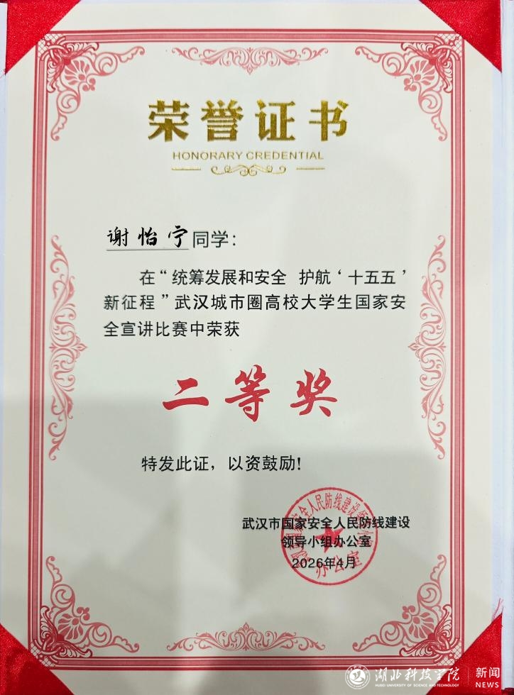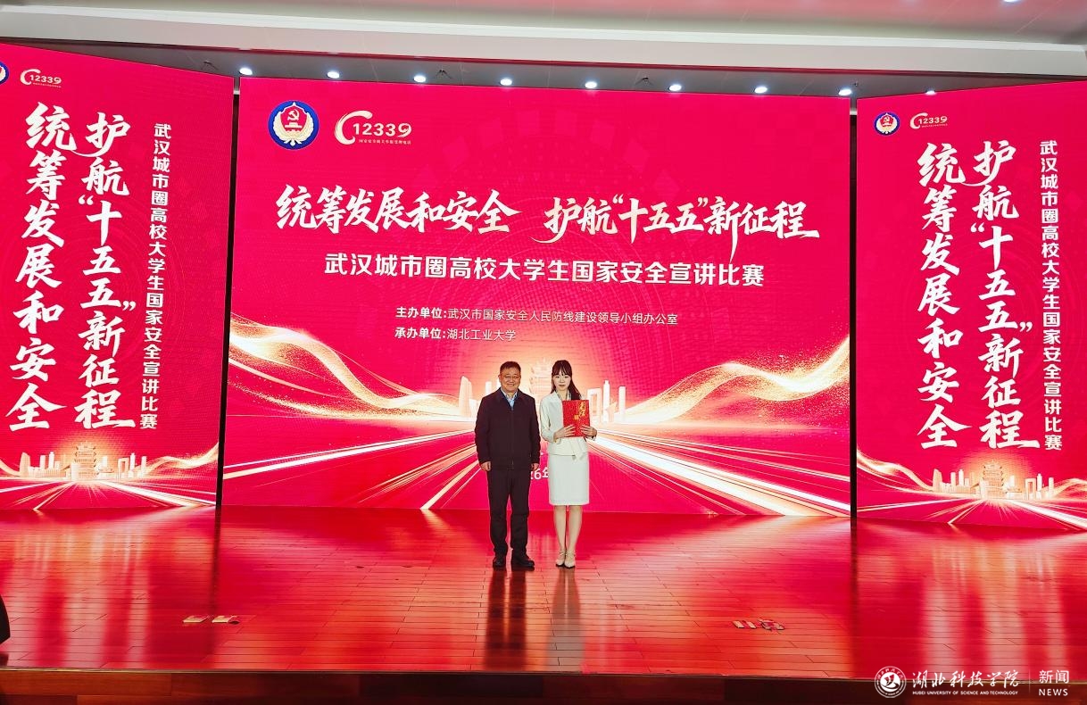 4月10日,由武汉市国家安全人民防线建设领导小组办公室主办的“统筹发展和安全,护航‘十五五’新征程”武汉城市圈高校大学生国家安全宣讲比赛在湖北工业大学落下帷幕。我校核技术与化学生物学院学生谢怡宁经咸宁市国家安全局推荐、学工部(处)全程指导参赛,凭借原创主题宣讲斩获二等奖,并成功入选武汉城市圈高校大学生国家安全宣讲团队,充分展现湖科学子维护国家安全的青春担当与良好风貌。校党委副校长李志雄、咸宁市国家安全局主要领导、学工部(处)副部长杨孝及指导老师现场观赛并为学生鼓劲。