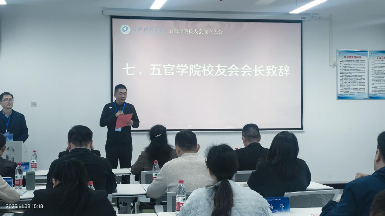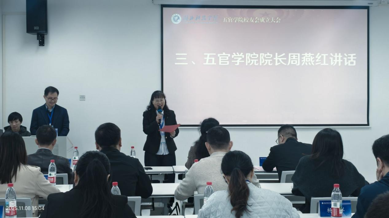 在全体校友的见证下,刘芳宣读了关于成立五官学院校友会的批复文件,并代表学校致辞。她向校友会的成立表示热烈祝贺,对筹备组成员的辛勤付出表示感谢,希望校友们持续关注母校发展,积极推动科技成果转化和人才培养,在服务地方经济社会发展中展现医学人的责任担当。