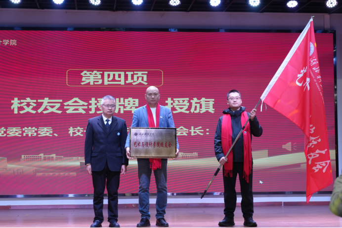 艺术与设计学院院长徐义平向出席大会的领导嘉宾做了院情介绍,校友与社会合作处刘芳副处长宣读了学校校友总会关于成立艺术与设计学院校友分会的批复文件。李岱校长为第一届校友会会长徐伟授牌、向秘书长刘腾飞授旗。周承勇向校友会理事会成员颁发聘书。