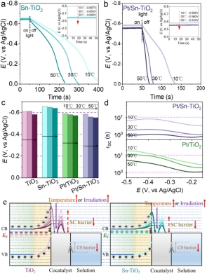 团队采用水热法合成Sn掺杂TiO2光催化剂(Sn/Ti摩尔比0%-5%),并通过光沉积负载Pt助催化剂(图1)。关键创新在于利用开路电位方法(OCP)分析量化SC界面电子转移时间常数(τSC),并结合自行设计的固定床反应器克服短波长光在液相中的穿透性难题。