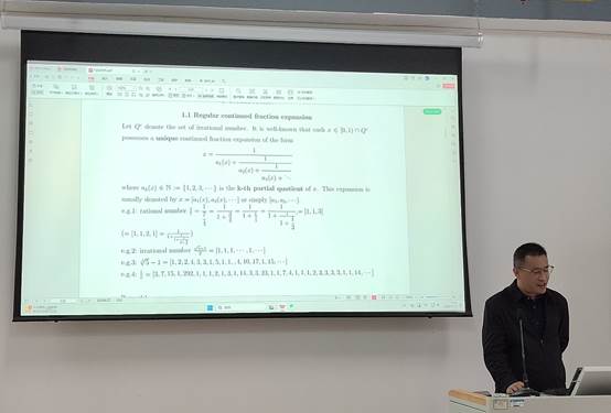 桂咏新教授以《正则连分数展开中部分商频率的大偏差谱》为题,提出"部分商频率的大偏差谱"概念,并通过严谨的数学推导证明其与精细多重分形谱的等价性。研究团队成功构建出大偏差谱的显式表达式,为分析正则连分数展开中发散点的分形特征提供了全新理论工具。该成果在数论与分形几何交叉领域具有重要学术价值,现场师生就谱函数的构造方法与数学意义进行了交流。