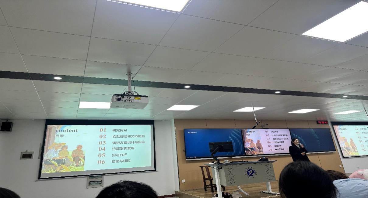 比赛采取“报告+PPT”评审方式,以70%报告分+30%PPT展示分计算团队成绩。报告陈述时间为7分钟,各团队按照抽签顺序依次上台,紧贴社会需求、前沿科技,围绕康养经济、数字经济、农旅融合等多个热点主题展开汇报。评委老师从研究选题、文献研究、方案设计、调查实施、分析结论、报告文本、研究创新等方面进行评分。现场气氛融洽,师生互动积极。