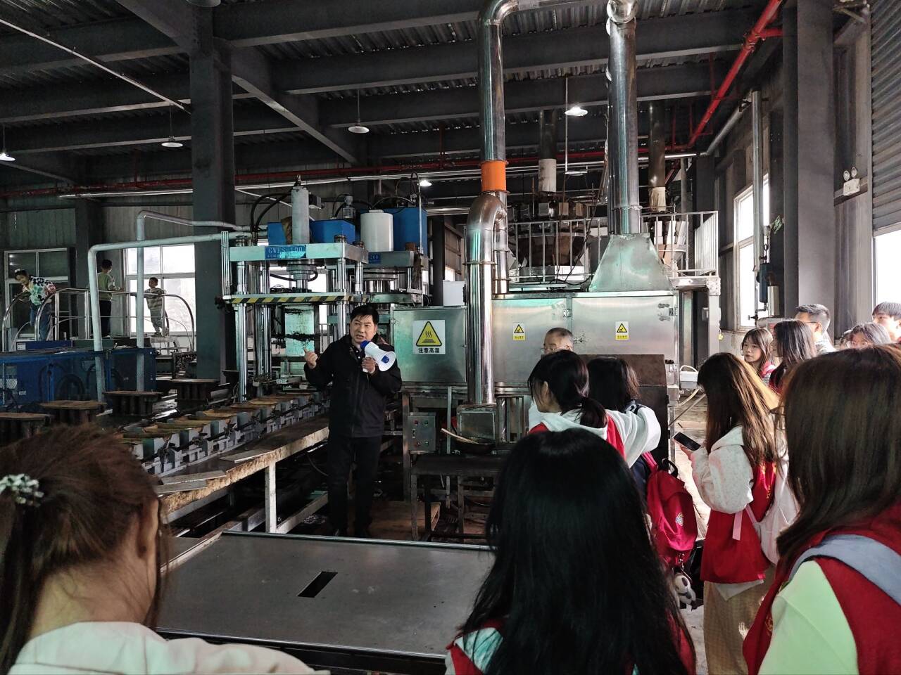 随后前往湖北省赵李桥茶厂这家成立于1953年的老牌国企,在此带队老师定光平教授详细介绍了该厂的制度变迁:建国初期党和国家发挥社会主义公有制集中力量办大事的优势,迅速完成了这家当年世界最大的紧压茶厂的建设;2008年以后该厂又先后经历了“国退民进”“国进民退”的演变。随后师生们近距离观摩了非遗展览馆、现代化压制生产线、渥大堆陈化仓储,与非遗传承人、技术人员交流,探寻青砖茶传统工艺与现代工业的融合之道。