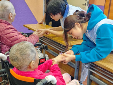 随后,志愿服务队组织了多项适老互动活动。在手指操教学环节,志愿者通过分解演示、耐心指导,帮助老人们活动手指关节,促进血液循环;手工剪纸活动中,老少配合,共同完成一幅幅生动作品,现场气氛温馨融洽;在修剪指甲服务中,队员们动作轻柔、操作专业,展现出对长者无微不至的关怀。