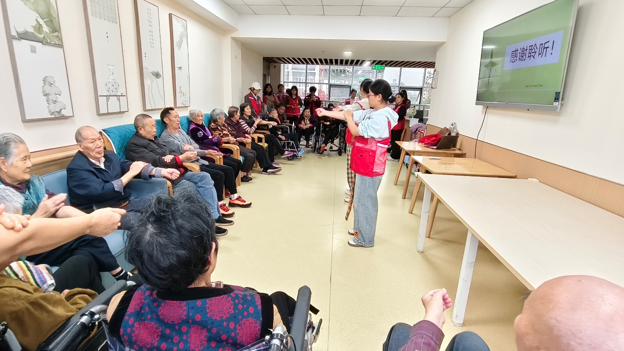 宣讲结束后,文艺表演与趣味游戏轮番上演,将现场气氛推向高潮。王可婷、代裕恒带来的舞蹈《日不落》节奏轻快,引得老人们纷纷拍手称赞;刘馨演唱的《New Boy》明快动听,志愿者们还走到老人身边轻声互动;杨静怡、黄婉夏的魔术表演更是激发了老人们的兴趣,不少人凑近观看,不时发出惊叹。互动环节中,罗慧仪、郭晴、徐逸瑄组织了“你划我猜”游戏,选用老人熟悉的词语引导大家积极参与;朱瑞涵、白耀华主持的趣味答题环节围绕健康常识展开,答对的老人还获得了小礼品,现场欢声笑语不断。