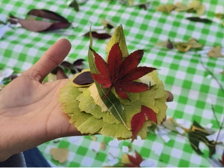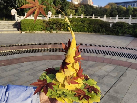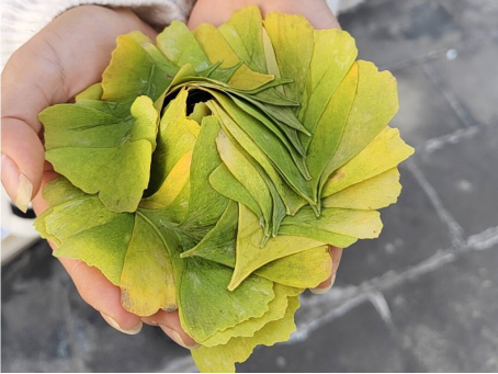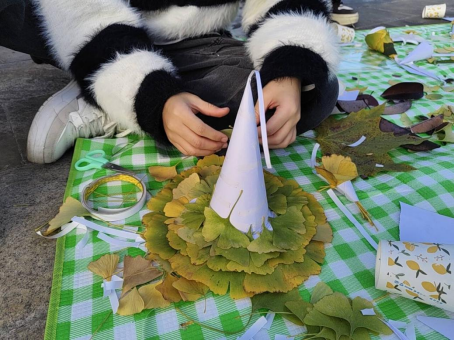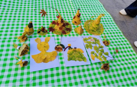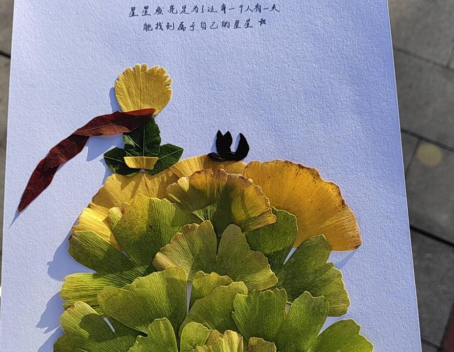 在创作环节中,同学们热情高涨,纷纷投入到手工制作中。大家或独立构思,或小组协作,不断尝试不同的制作方法。有的同学将形如蝶翼的银杏叶稍作修剪,拼贴成栩栩如生的“银杏蝴蝶”;有的将叶片层层叠叠,卷制成优雅的“银杏玫瑰”;还有同学融合枯枝、枫叶等自然元素,创作出富有秋日意境和校园特色的贴画作品。此外,更有同学发挥创意,将银杏叶制作成精致书签、迷你礼帽等实用小物,每一件作品都凝聚了同学们的巧思与情感。